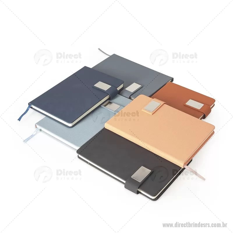 Caderneta de capa dura confeccionada em couro sintético, com acabamento elegante e fecho magnético para maior praticidade. Possui placa metálica personalizável na capa, ideal para aplicação de logotipo ou nome. Conta ainda com marca-página em fita de cetim e aproximadamente 96 folhas internas brancas pautadas, proporcionando organização e conforto na escrita. - - DRTRSBLC281