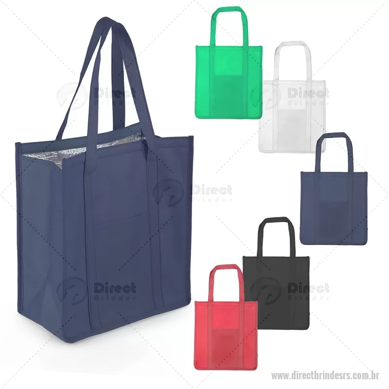 Sacola térmica confeccionada em TNT com gramatura de 80 g/m². Possui interior costurado com revestimento em algodão e folha de alumínio de 2 mm, auxiliando na conservação da temperatura de alimentos e bebidas. Conta com bolso frontal, fechamento em velcro e alça de 50 cm de ponta a ponta, proporcionando praticidade no transporte. - - DRTRSBT118