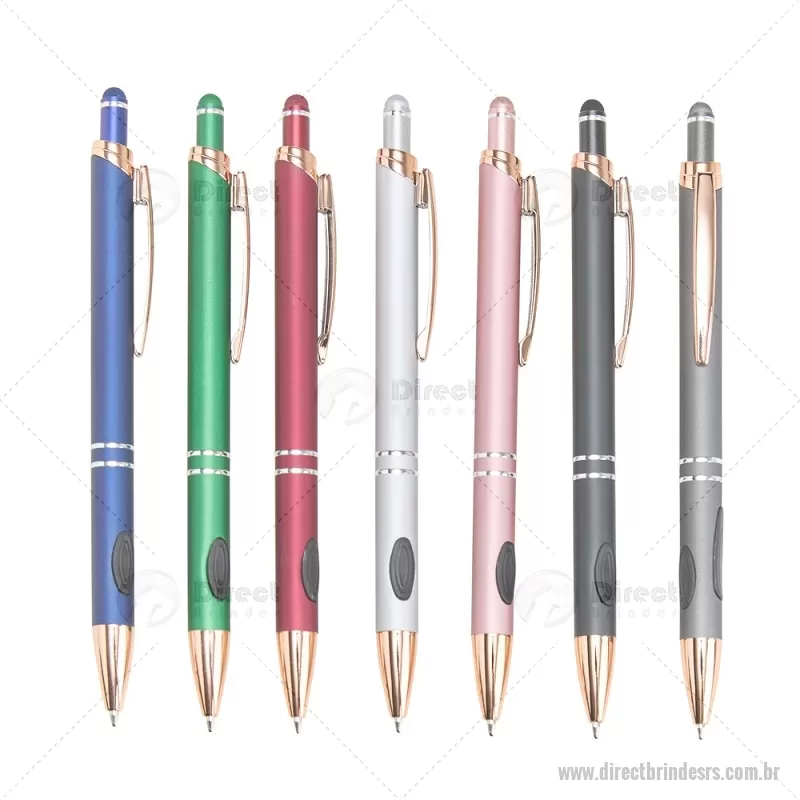 Caneta Metal Touch A elegância e o conforto combinados em uma única caneta esferográfica para garantir uma escrita mais agradável através da sua construção metálica e seu par de grips em borracha, além de ponta e clipe em plástico. Sua carga azul de 1.0 mm possui acionamento por clique com ponteira emborrachada que que permite seu uso como uma caneta touch para interação com smartphones, tablets e demais dispositivos de telas touchscreen. Largura : 1,5 cm x Circunferência : 4,5 cm x Comprimento : 14 cm Peso aproximado (g): 17 - - DRTRSCMT293