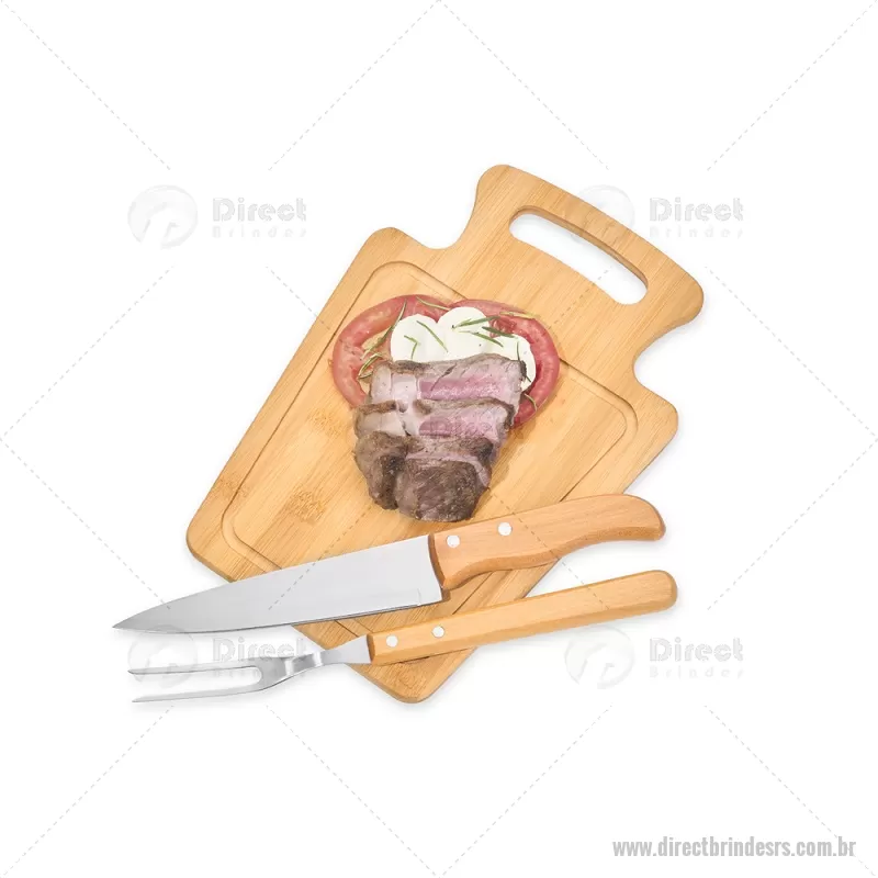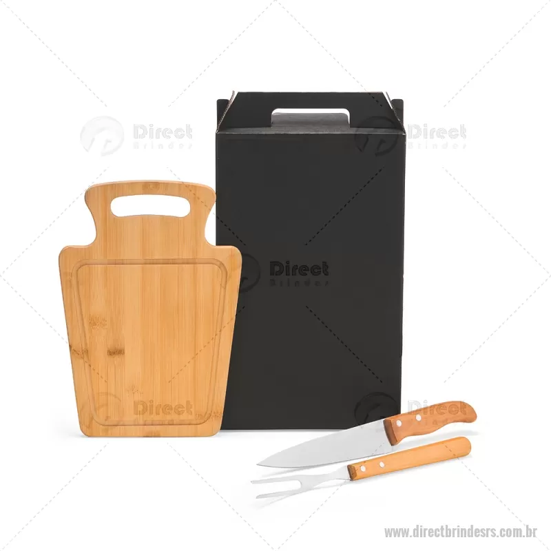 Conjunto Para Churrasco Em Bambu / Madeira / Inox - 3 Pçs Composto por tábua em Bambu com 30x21x1,2 cm; faca 7'' e garfo em Madeira/Inox. Dimensões do Produto Tábua: 30x21x1,3 cm Sugestão de Personalização Uma gravação a Laser na petisqueira e lâmina da faca; uma gravação em Silk/Digital na caixa. Embalagem : Caixa Preta 40x21,8x4,5 cm (AxLxP) Peso: 619 g (com embalagem) - - DRTRSKCH095