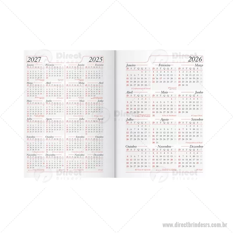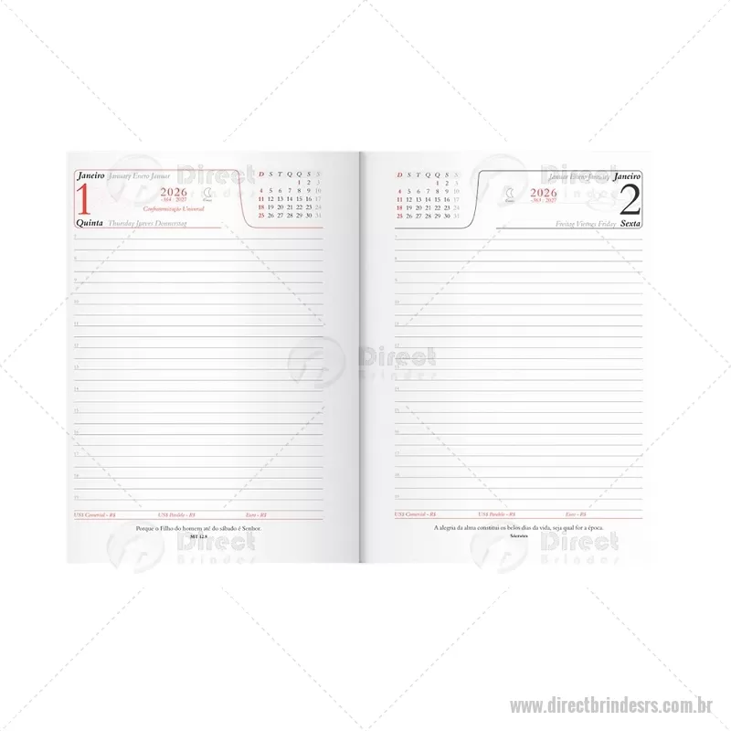 Agenda diária 2026 com capa em couro sintético e marcador de páginas em fita de cetim. Inclui seções para dados pessoais, calendários de 2025 a 2027, contatos, planejamento e mapas, ideal para organização completa do dia a dia. - - DRTRSAGE034