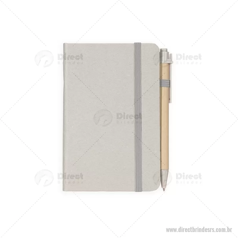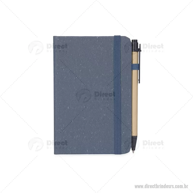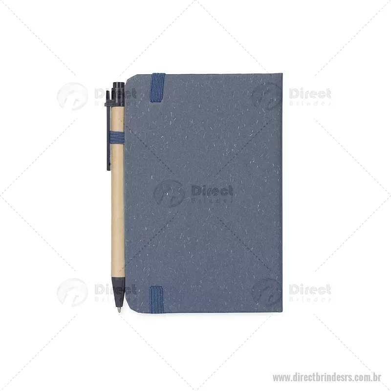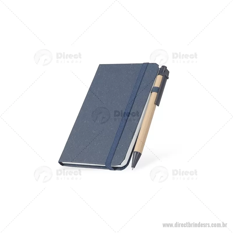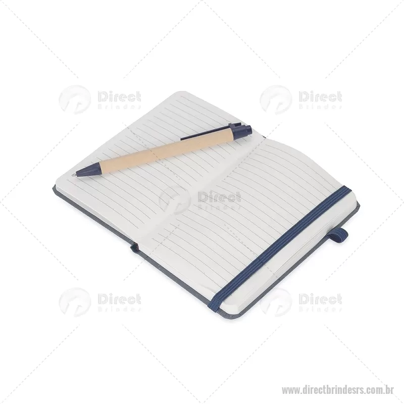 Caderneta ecológica com capa dura revestida em fibra de palha de trigo, contendo cerca de 80 folhas pautadas, duas folhas de guarda, elástico para fechamento e porta-canetas. Acompanha caneta esferográfica azul 1,0 mm com corpo em papelão, clip e acionamento por clique. - - DRTRSBLC270
