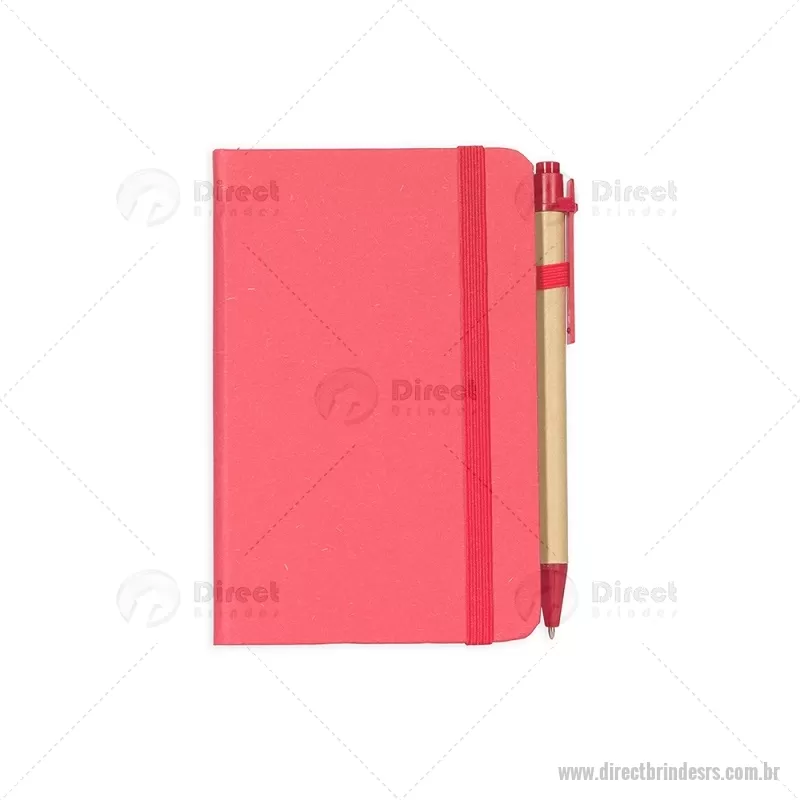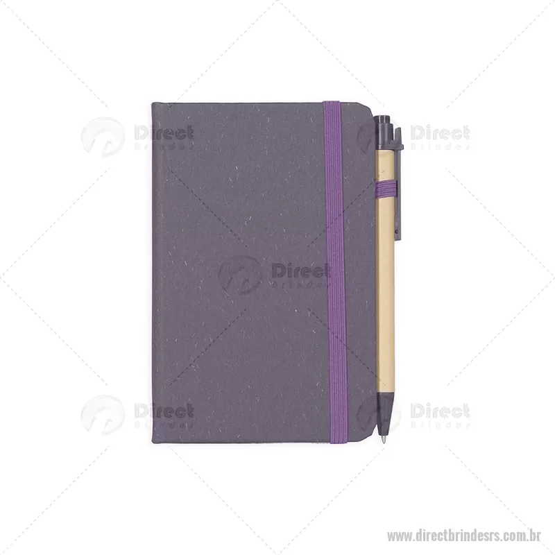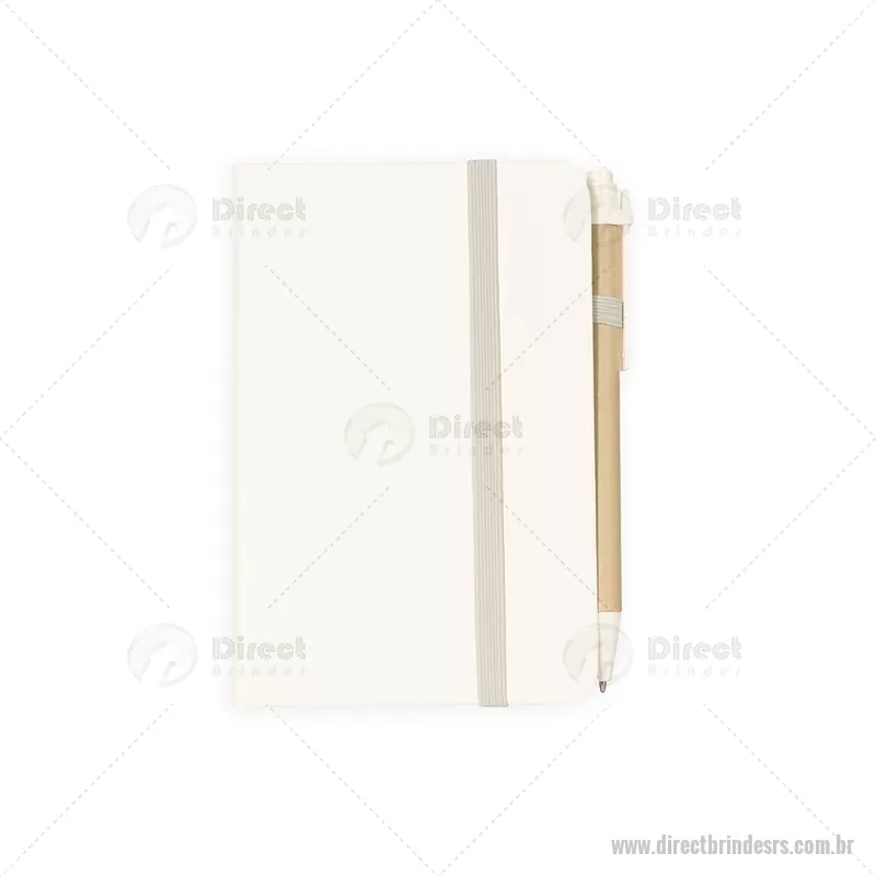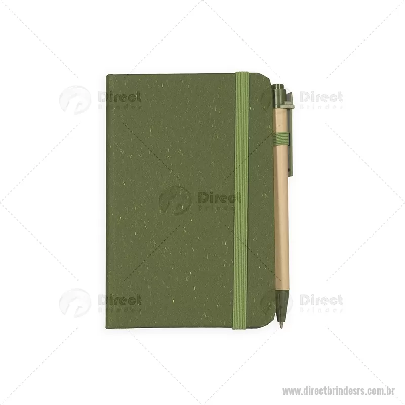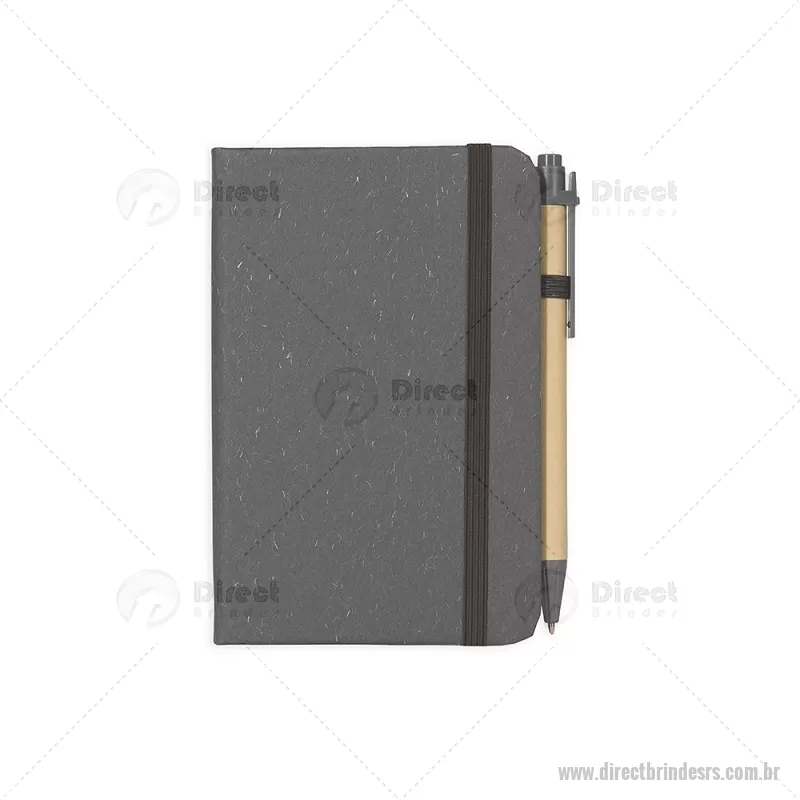 Caderneta ecológica com capa dura revestida em fibra de palha de trigo, contendo cerca de 80 folhas pautadas, duas folhas de guarda, elástico para fechamento e porta-canetas. Acompanha caneta esferográfica azul 1,0 mm com corpo em papelão, clip e acionamento por clique. - - DRTRSBLC270