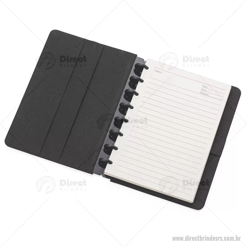 Caderno de anotações com capa dura em material sintético, contendo: Miolo de 80 folhas pautadas na cor bege; Porta Canetas; Porta Cartões; Obs.: As folhas do miolo são destacáveis. Dimensão do produto: 22,3x18,0x2,1cm (AxLxP) Peso do Produto: 0,438kg - - DRTRSCAD025