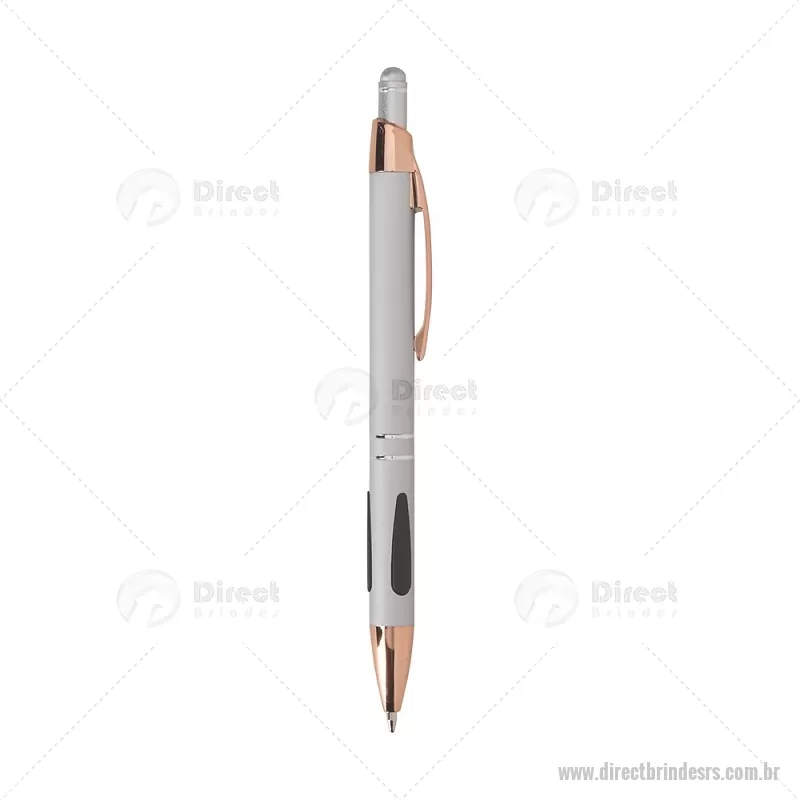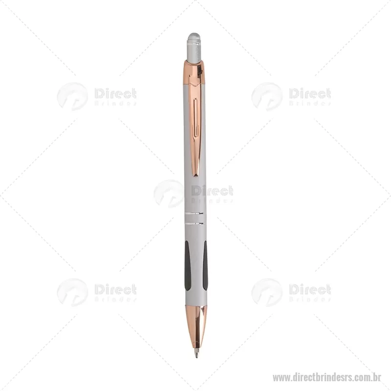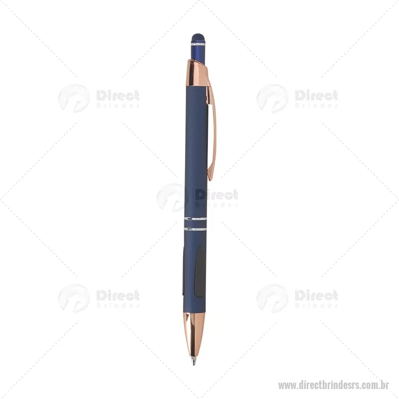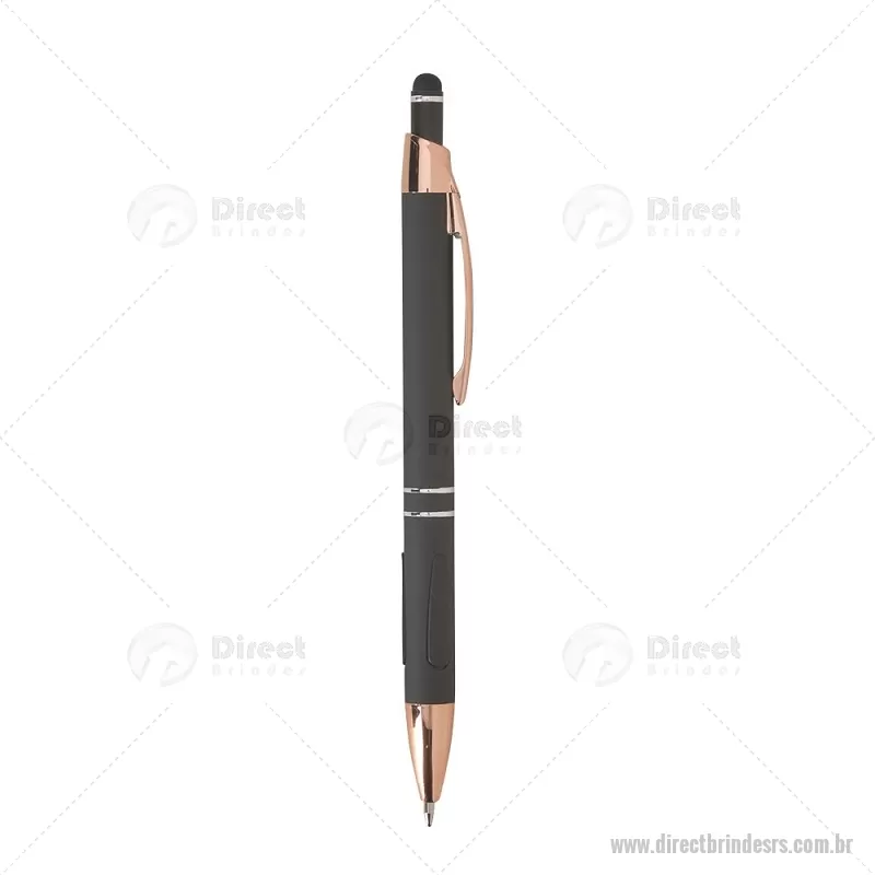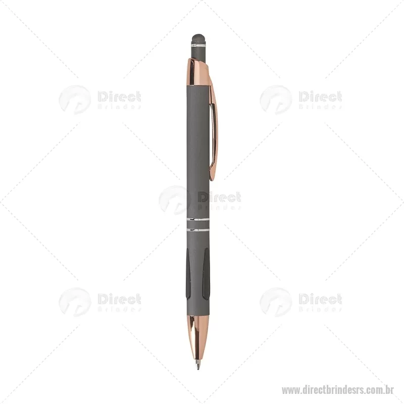 Caneta em metal com detalhes emborrachados, carga esferográfica azul 1,0 mm e acionamento por clique. Possui ponta touch emborrachada para uso em telas sensíveis ao toque, unindo escrita e praticidade em um só item. - - DRTRSCMT295