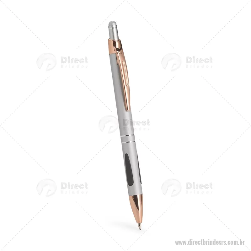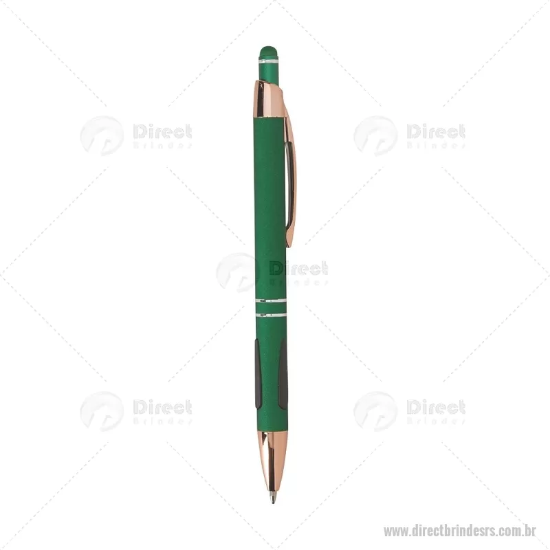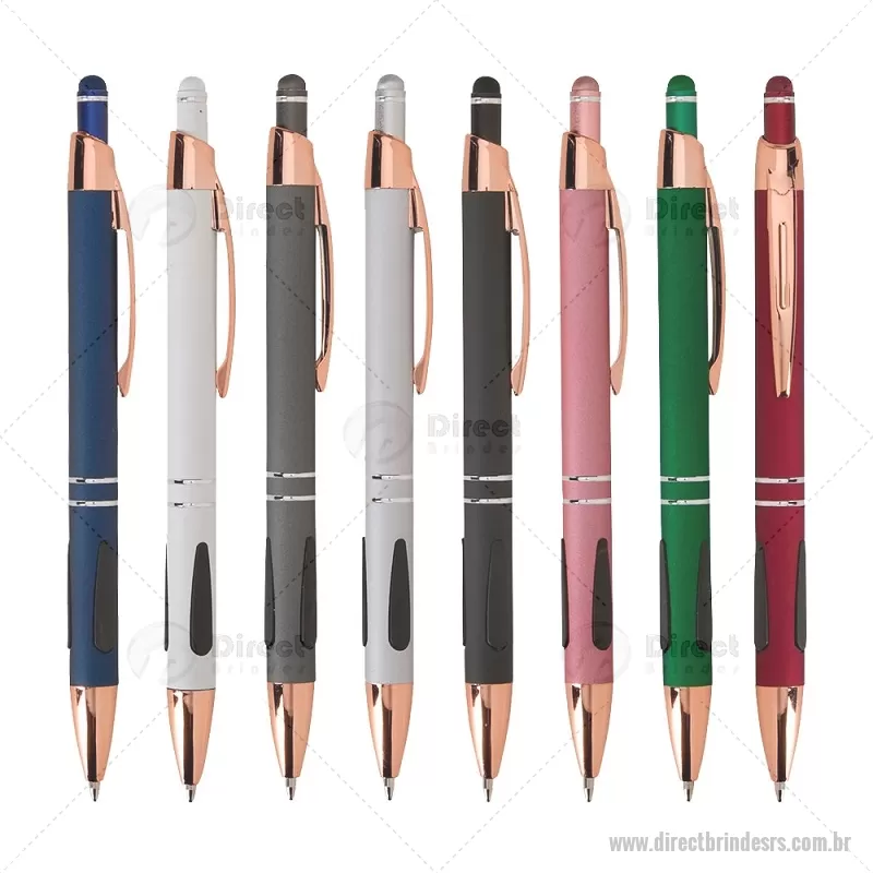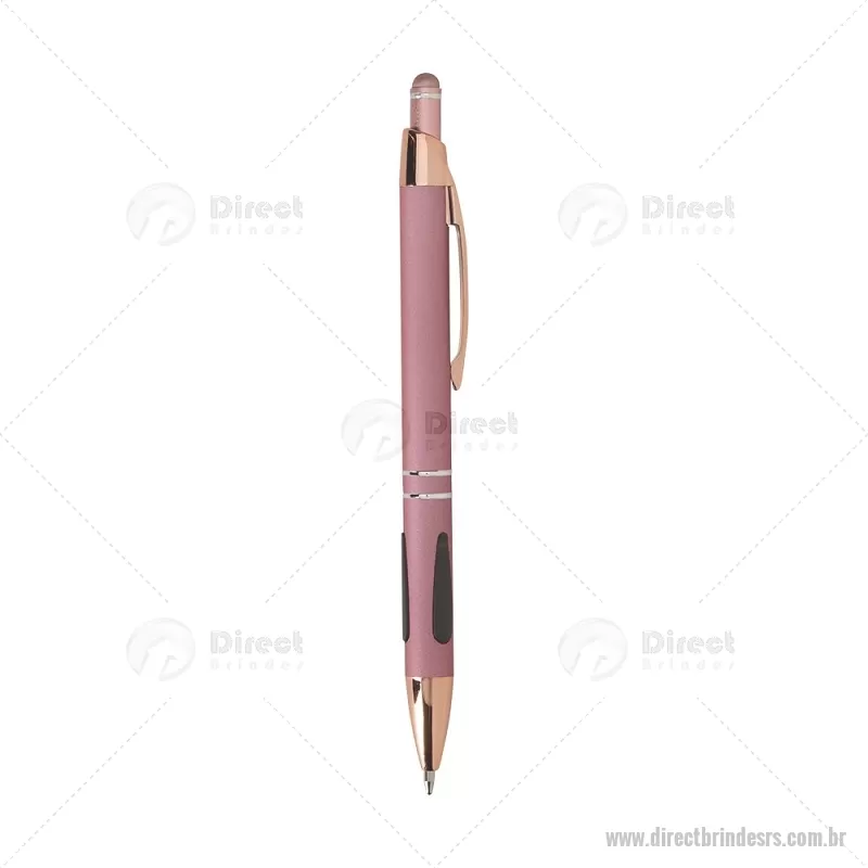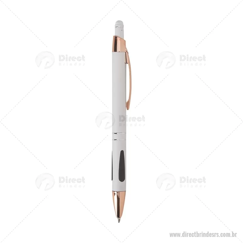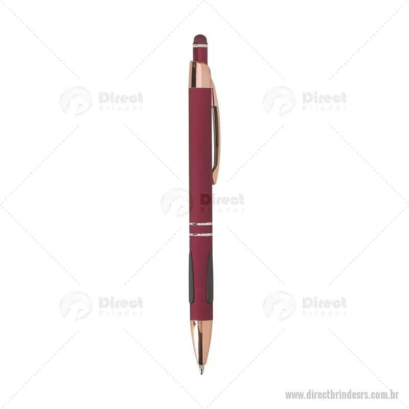Caneta em metal com detalhes emborrachados, carga esferográfica azul 1,0 mm e acionamento por clique. Possui ponta touch emborrachada para uso em telas sensíveis ao toque, unindo escrita e praticidade em um só item. - - DRTRSCMT295