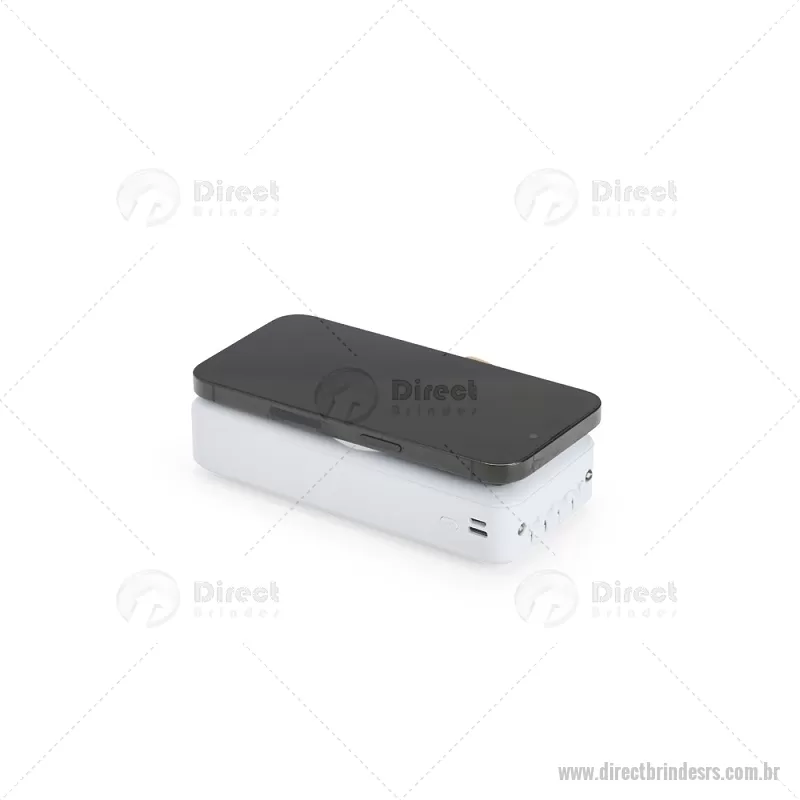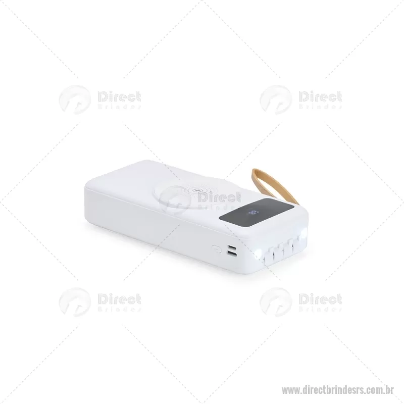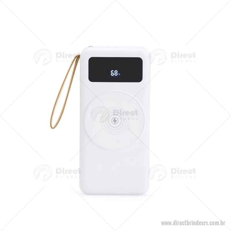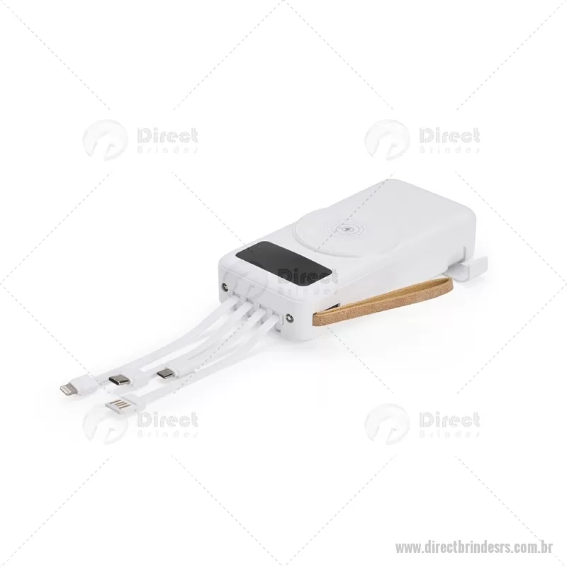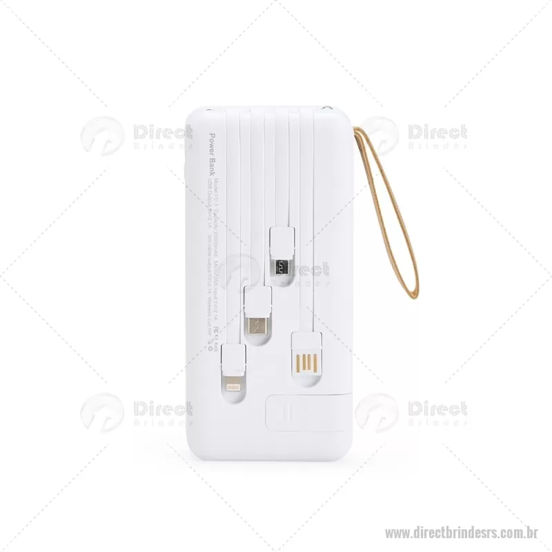 Carregador Power Bank USB 20.000mAh Descrição: Power bank em plástico com capacidade de 20.000mAh, painel de LED que indica o percentual de bateria, alça em couro sintético para transporte e suporte lateral que permite apoiar aparelhos na horizontal. Possui quatro cabos acoplados, incluindo: USB-C, Micro USB, Lightning e Cabo USB, além de espaço reservado para carregamento por indução de aparelhos compatíveis. Dispõe ainda de conexões USB-C, Micro-USB e USB para recarga do próprio dispositivo. Altura : 14,5 cm x Largura : 7 cm x Espessura : 3,5 cm Peso aproximado (g): 424 - - DRTRSTEC530