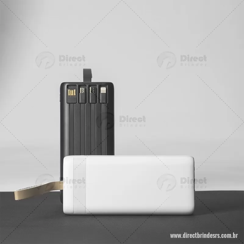 Power Bank 20.000mAh com Lanterna e Multissaídas Descrição: Power bank em plástico com capacidade de até 20.000mAh. Possui quatro cabos integrados com saídas Lightning, USB-C, Micro-USB e USB. Conta ainda com duas entradas, uma USB-A e outra USB-C, painel de LED numérico e lanterna frontal e alça fixa em couro sintético para transporte. Acompanha cabo USB-C. Altura : 15 cm x Largura : 6,8 cm x Espessura : 3 cm Peso aproximado (g): 418 - - DRTRSTEC532