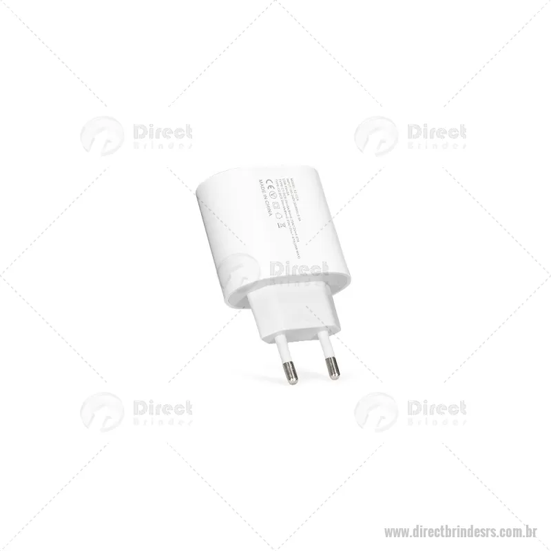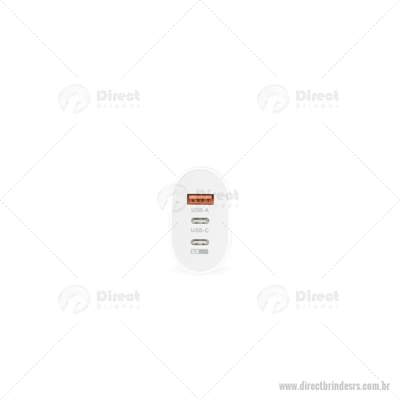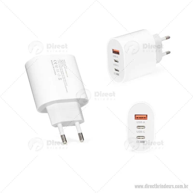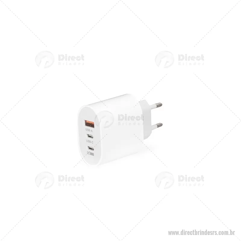 Carregador rápido em plástico leve e compacto, com três portas: uma USB-A e duas USB-C, incluindo uma opção de carregamento rápido de 20W. Ideal para recarregar diferentes dispositivos com praticidade. Cabo USB não incluído. - - DRTRSTEC535