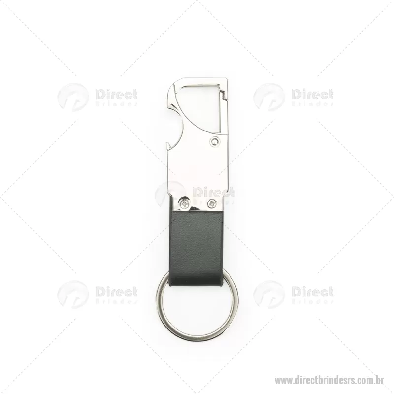 Chaveiro em metal com tira em couro sintético, equipado com mosquetão e função abridor de garrafas. Prático e funcional para o dia a dia. - - DRTRSCHV215