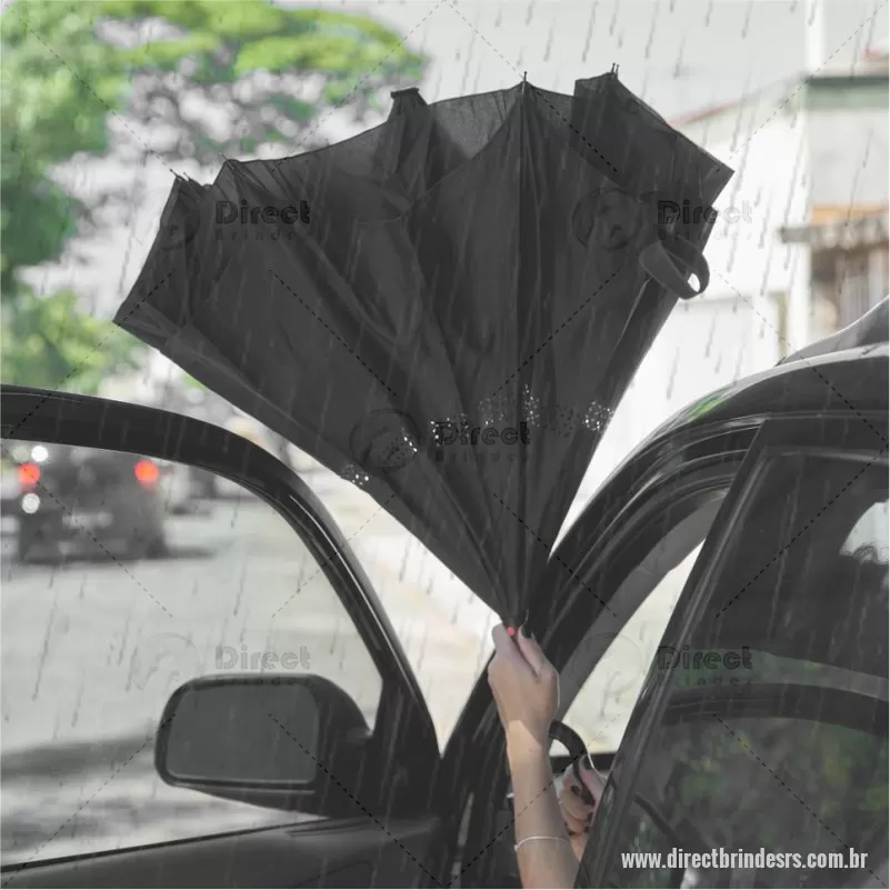 Guarda-chuva invertido com forro interno. Tecido de nylon impermeável preto, possui um mecanismo inovador permitindo que o usuário não se molhe ao entrar e sair de ambientes devido sua abertura invertida, quando feito o movimento para fechar as varetas inverterão para cima criando um formato circular impedindo a chuva de atingir o usuário, podendo “segurar” a chuva enquanto entra/sai de um ambiente e depois virando o guarda-chuva irá escorrer a água. Forro interno para preservação das 8 varetas, evitando contato com a água e assim prolongando seu tempo de uso sem enferrujar. Ao impulsionar o fechamento invertido fica mais rápido e prático o modo de secar e ser guardado, pode ser apoiado no chão que permanecerá em pé para escorrer a água. Pegador plástico fosco em formato C, botão acionador vermelho e fita com velcro(contorno marrom) para lacre. Tamanho total aproximado: Fechado: 79,5 cm x 9,4 cm – Aberto: ø 106 cm. - - DRTRSGCH015