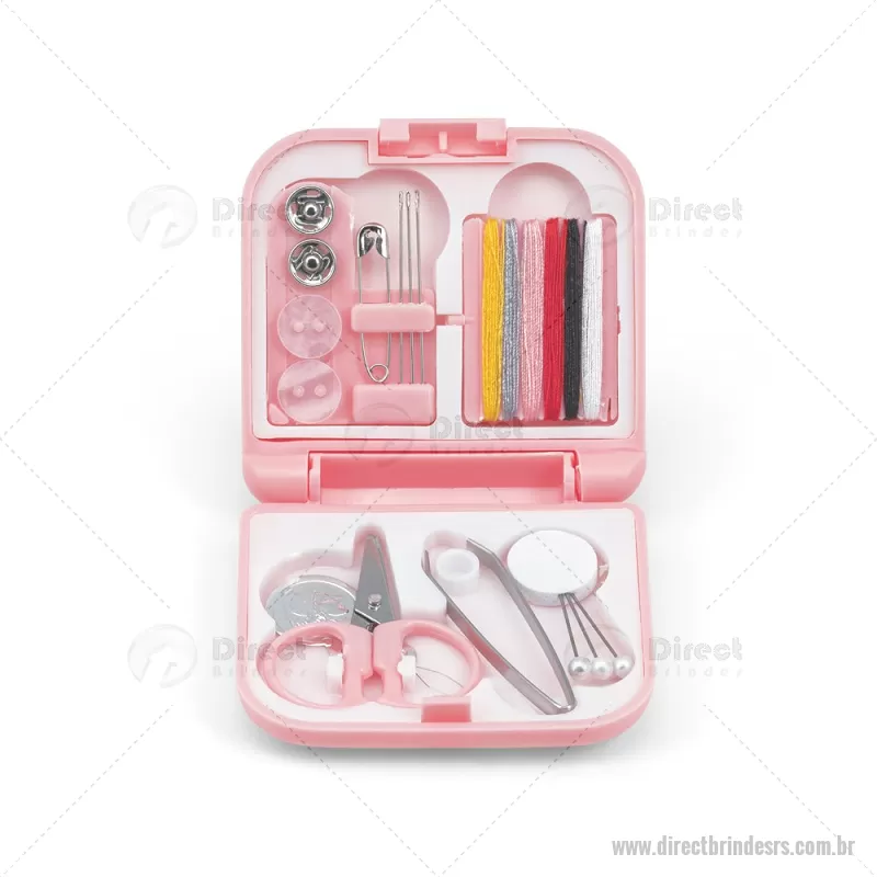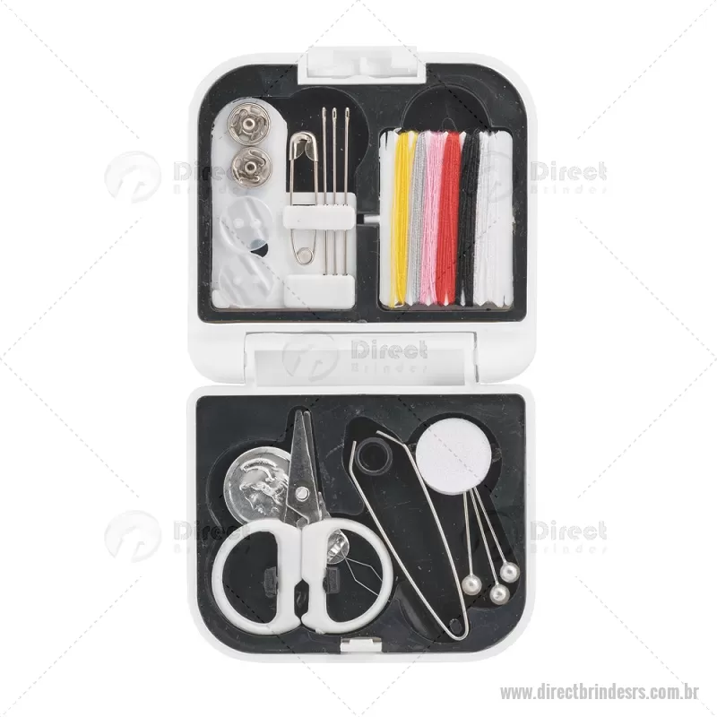 Kit de costura prático e leve para viagem Conjunto de costura prático e leve para levar em viagem. Composto por 3 alfinetes, 3 agulhas, 1 pinça, 1 tesoura, 1 enfia linha, 1 alfinete, 2 botões, 2 colchetes e 6 rolos de linhas de várias cores. Fornecido em estojo. Medidas: 70 x 21 x 65 mm Peso do Produto (g.): 46 - - DRTRSFEM084