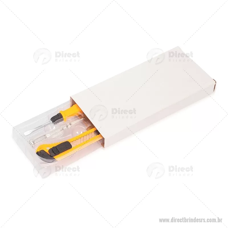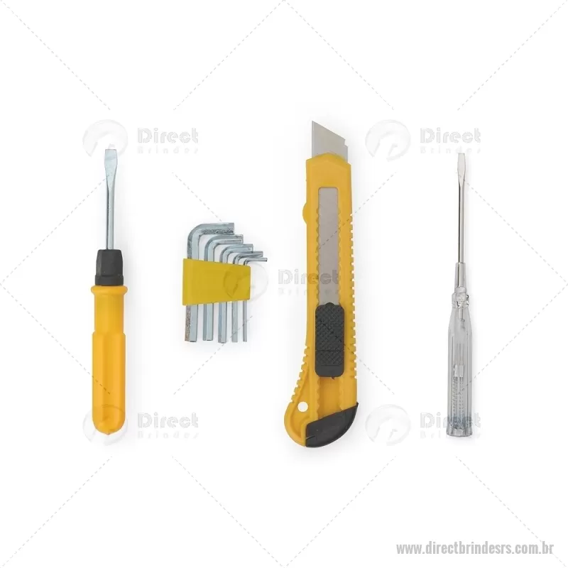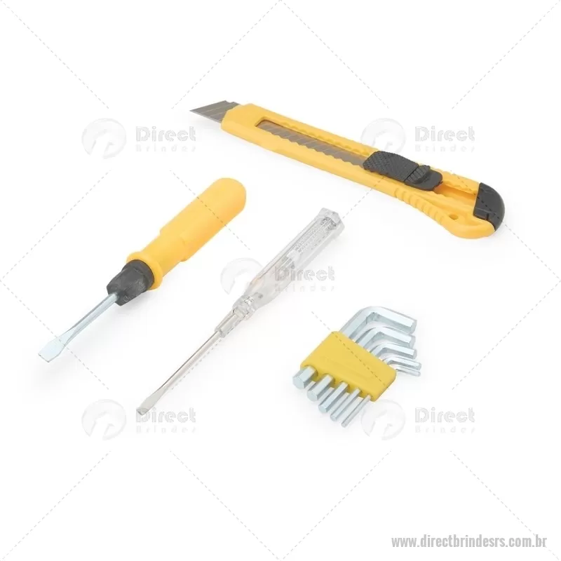 Kit de ferramentas compacto e funcional, ideal para pequenos reparos do dia a dia. Inclui estilete, chave de fenda teste, jogo de chaves Allen com 5 medidas e chave dupla com pontas fenda e Phillips. Produzido com acabamento em plástico resistente, oferece durabilidade e praticidade para resolver imprevistos com facilidade. - - DRTRSFER067