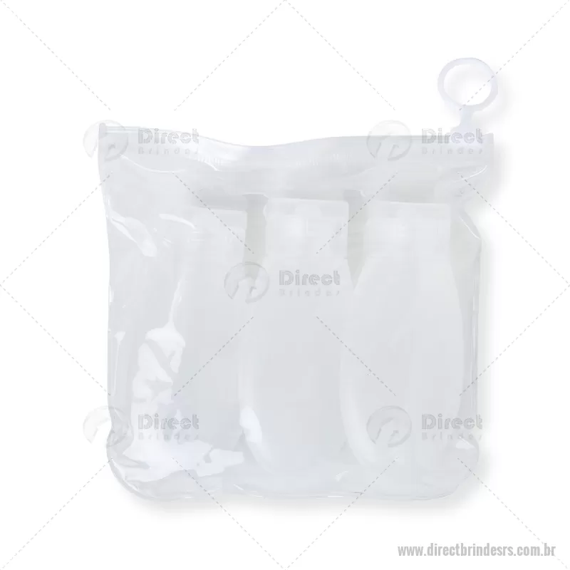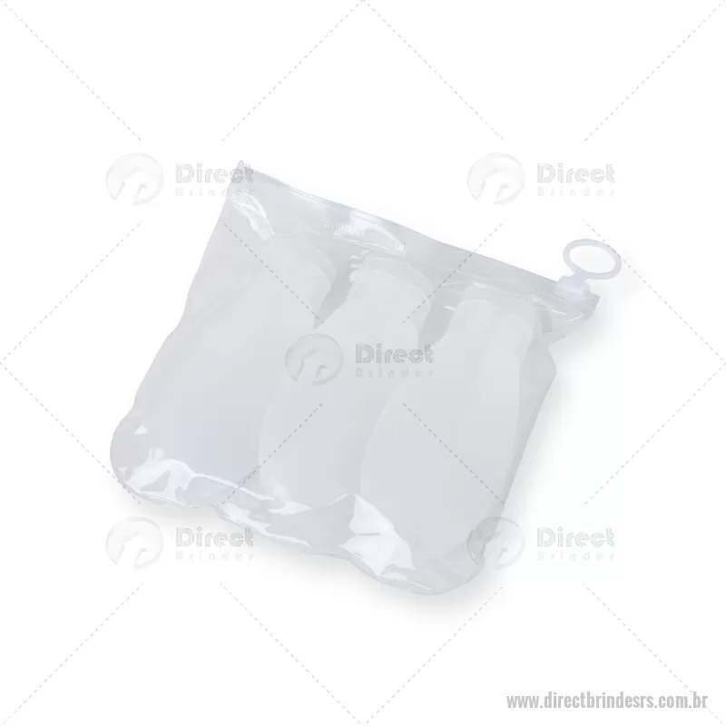 O kit viagem 3 Peças é a escolha perfeita para quem busca praticidade e organização durante as viagens. O conjunto inclui três frascos plásticos de 60ml, ideais para transportar líquidos e produtos de higiene pessoal, respeitando as normas de segurança para viagens aéreas. O estojo de PVC com ziplock mantém os itens organizados e seguros, além de evitar que a umidade espalhe para a área externa, caso os itens estejam molhados. Estojo: Altura : 14,9 cm x Largura : 15,1 cm Tamanho total aproximado (CxL): Frasco 10,7 cm x 5,1 cm Peso aproximado (g): 50 - - DRTRSKVG018