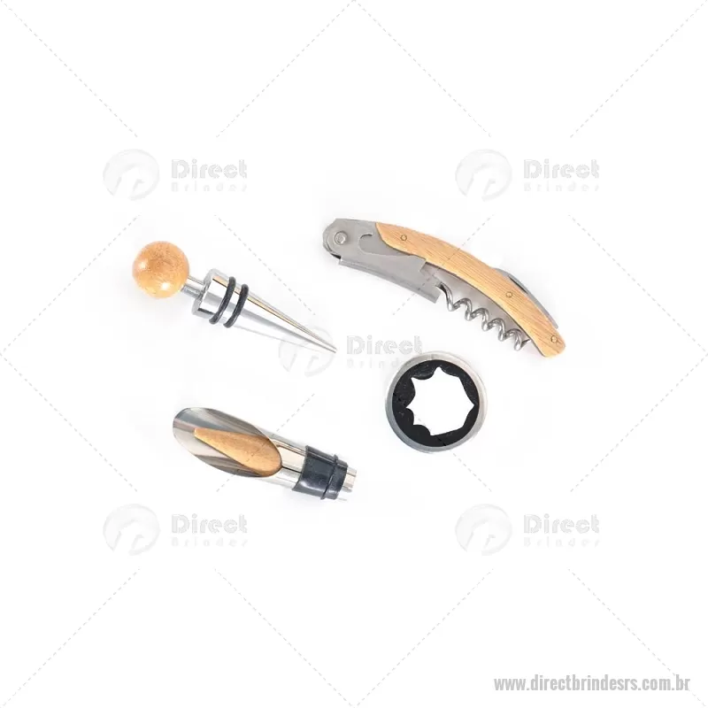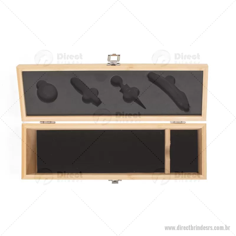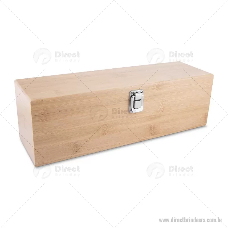 Kit Vinho em bambu com interior em EVA e fecho em inox, suporte para garrafa de vinho de 750 ml (padrão). Contém: saca-rolha de metal com detalhes em bambu e cortador de lacre, anel corta-gotas de metal, bico para servir de metal com tampa em bambu e tampa de metal com detalhe em bambu. Peso do Produto: 0,997kg Dimensão do Produto: 11x36x11cm *Não acompanha garrafa vinho, imagem meramente ilustrativa. - - DRTRSKVI051