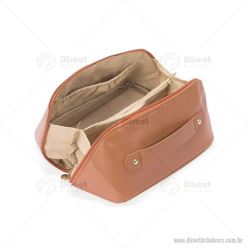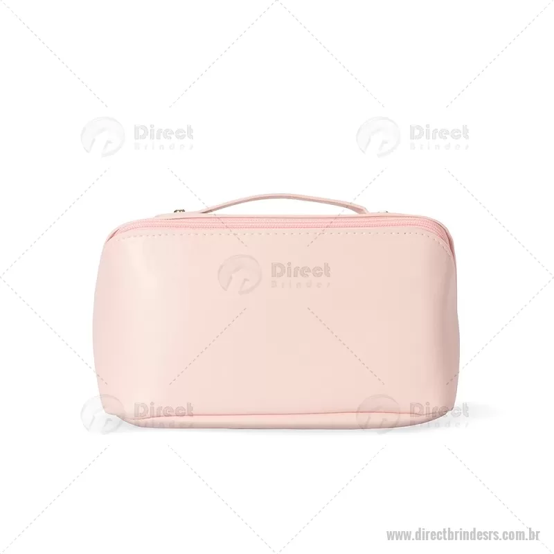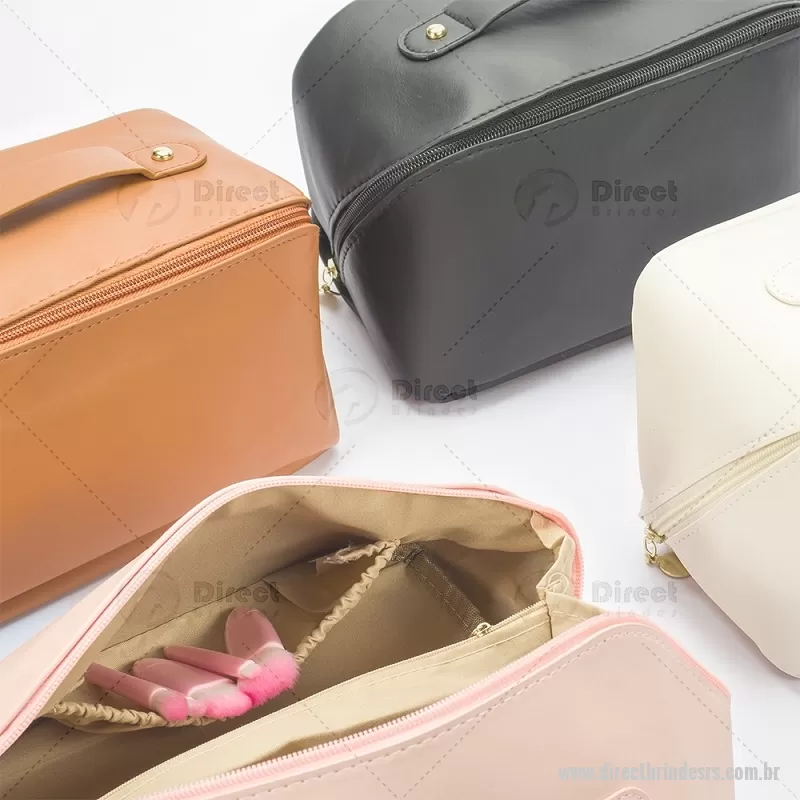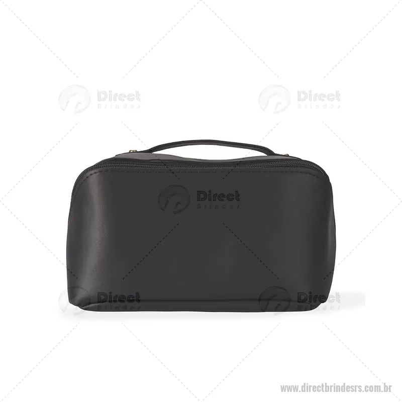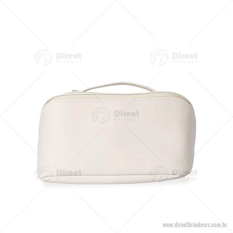 Nécessaire em PU impermeável com abertura em 180 graus, estilo concha, oferecendo fácil visualização dos itens. Possui compartimento interno amplo com dois bolsos laterais e um bolso central com zíper, além de alça para transporte. Ideal para organizar acessórios e produtos pessoais. - - DRTRSNC146