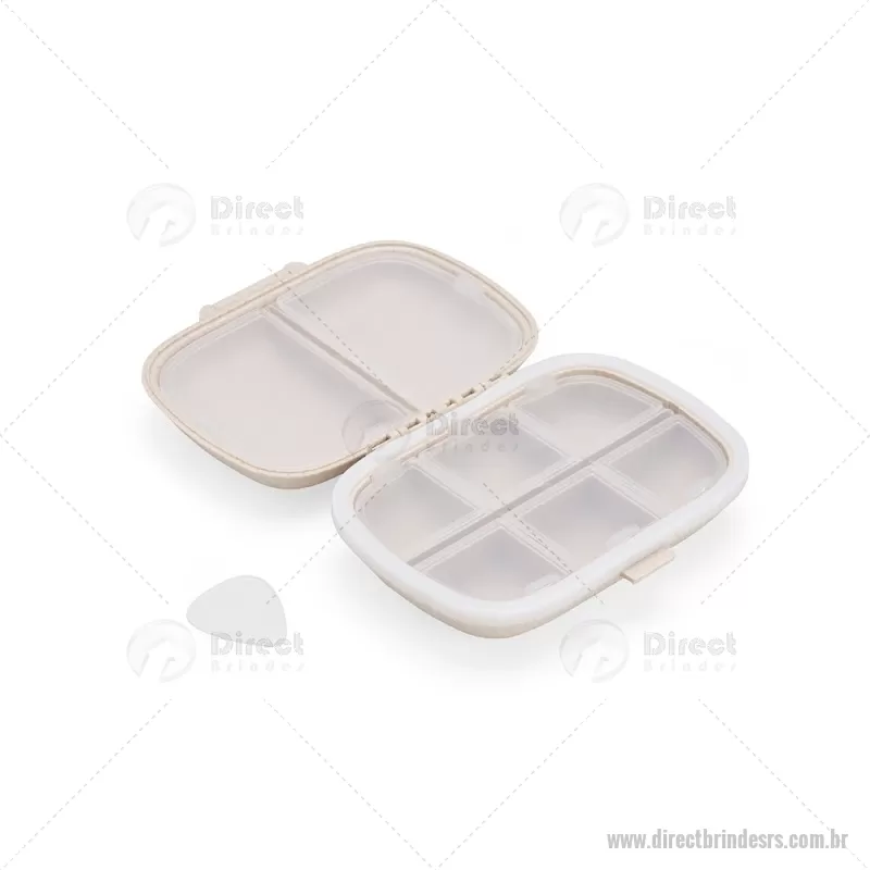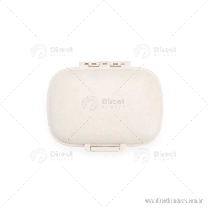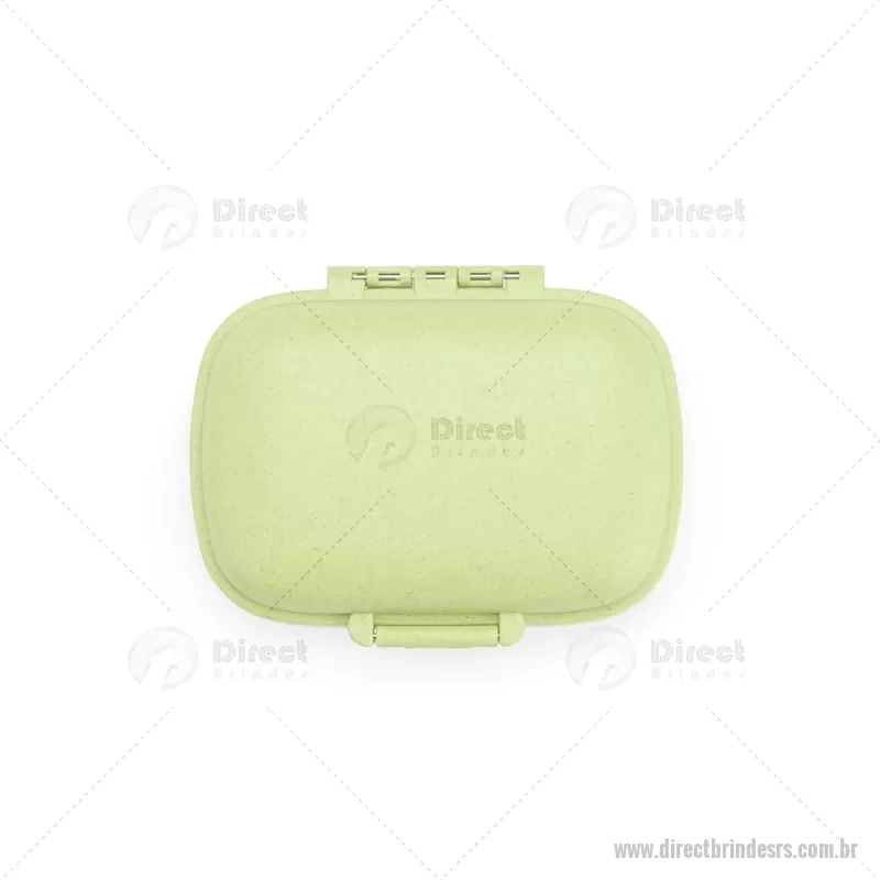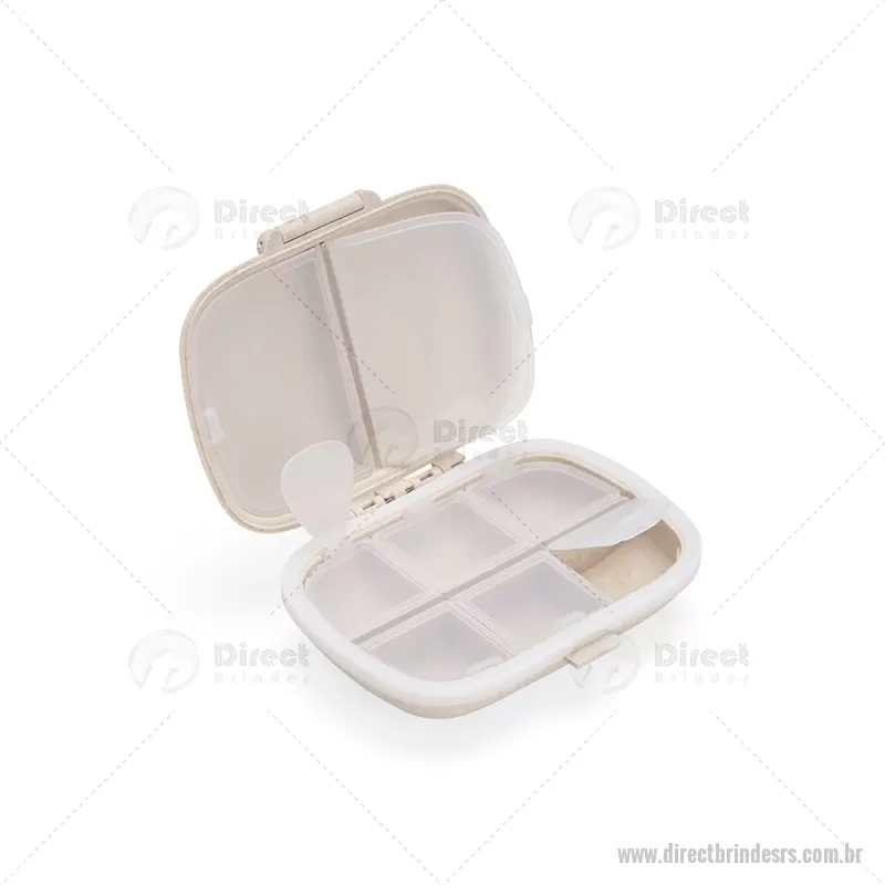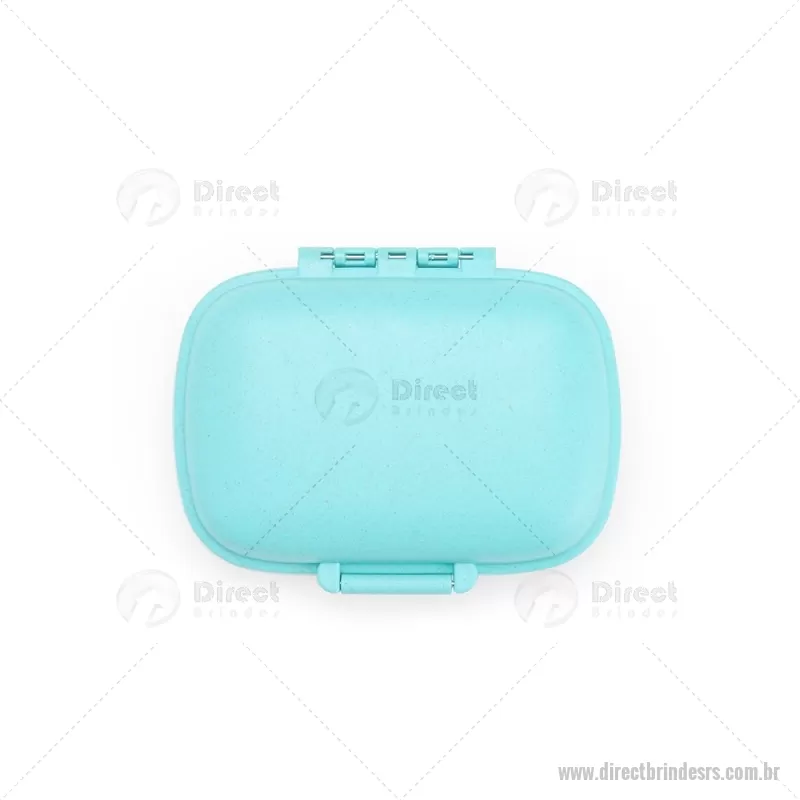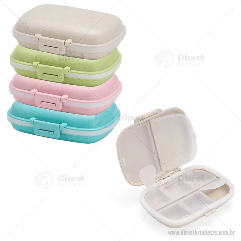Porta-Comprimidos Plástico Porta-comprimidos compacto feito em plástico obtido da palha de trigo e anel de vedação para as bordas em silicone. Possui oito compartimentos com tampas removíveis, sendo dois maiores com capacidade de até 30ml e seis menores com até 10ml cada. Acompanha palheta multiuso. Largura : 8,6 cm x Espessura : 3,6 cm x Comprimento : 11 cm Peso aproximado (g): 72 - - DRTRSPCP016