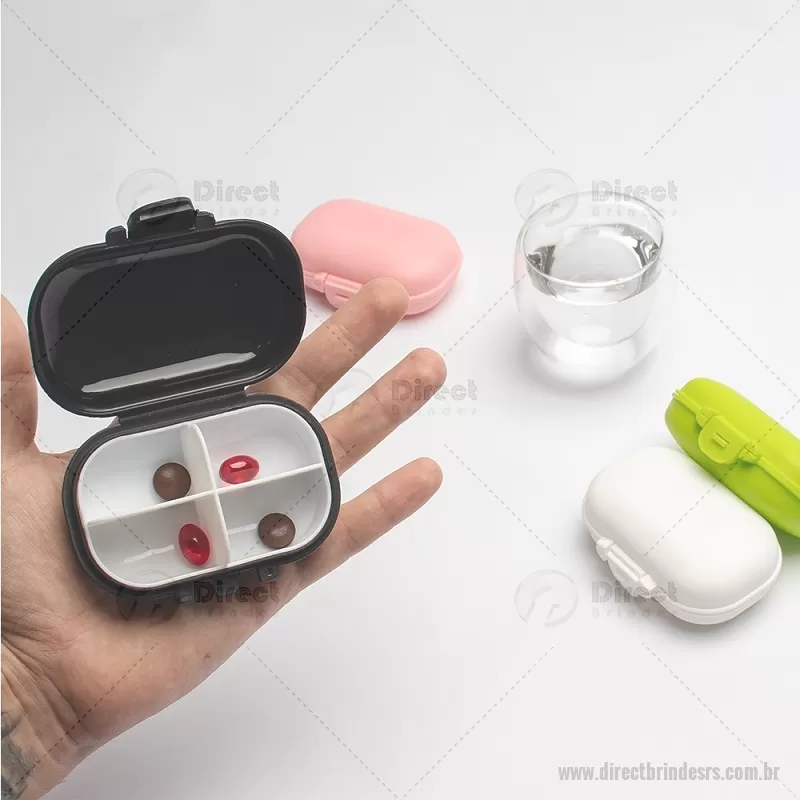 Porta-Comprimidos Plástico Descrição: Porta-comprimidos feito em plástico. Possui compartimento removível com quatro divisórias, o que facilita a limpeza e ajuda a organizar medicamentos ou pequenos objetos. Largura : 6,5 cm x Espessura : 3,7 cm x Comprimento : 9,6 cm Peso aproximado (g): 36 - - DRTRSPCP019