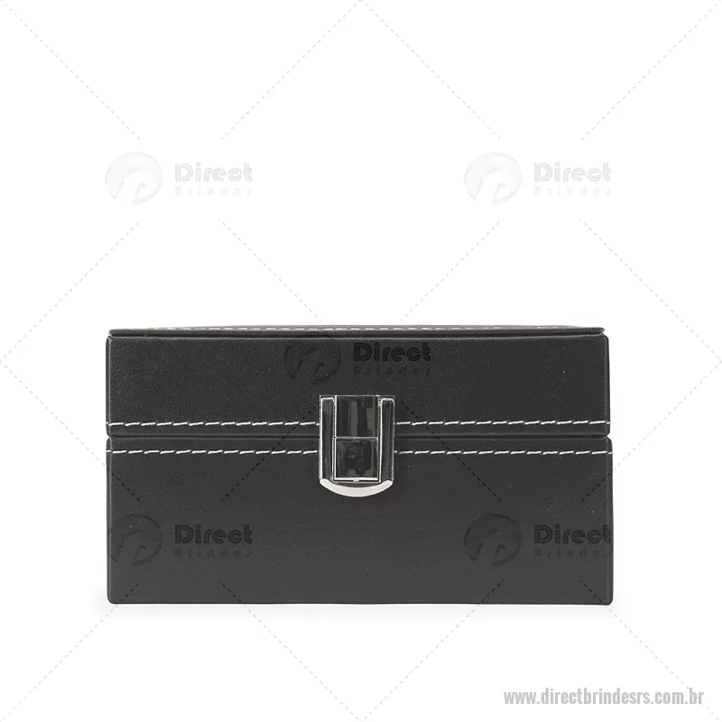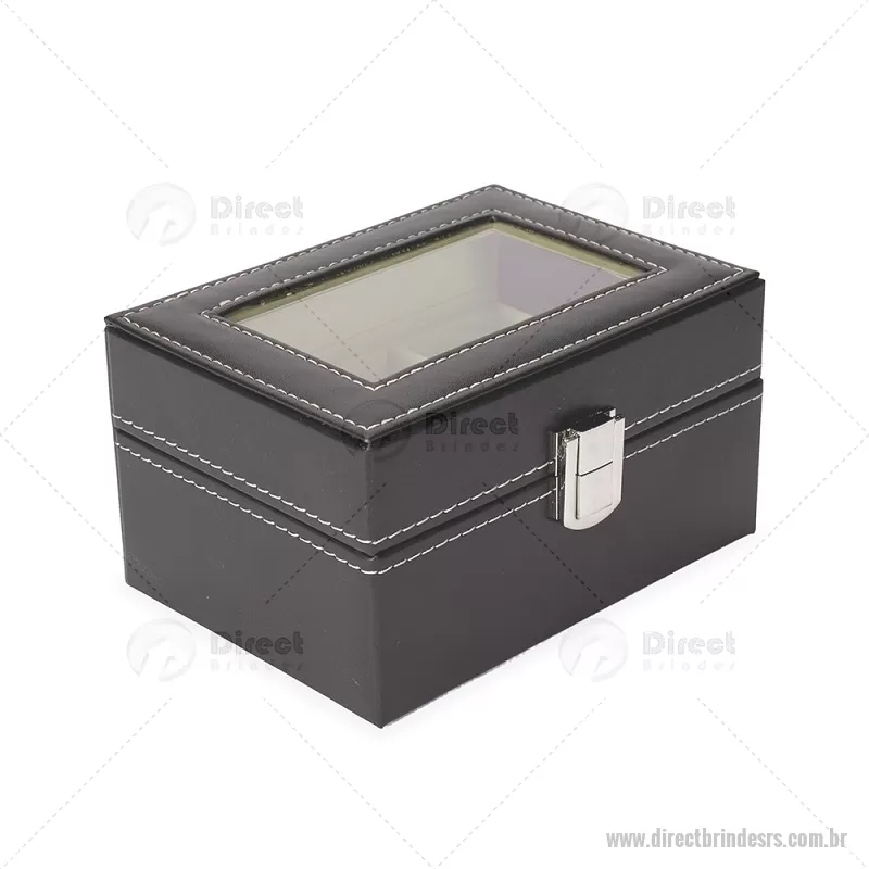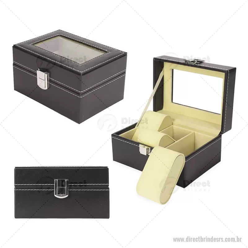 Estojo porta relógios com acabamento externo em couro sintético à base de PVC e interior revestido em veludo macio. Possui duas divisórias com almofadas removíveis para acomodar os relógios, tampa com visor de vidro e fecho com trava de segurança, garantindo proteção e organização com elegância. - - DRTRSPREL002