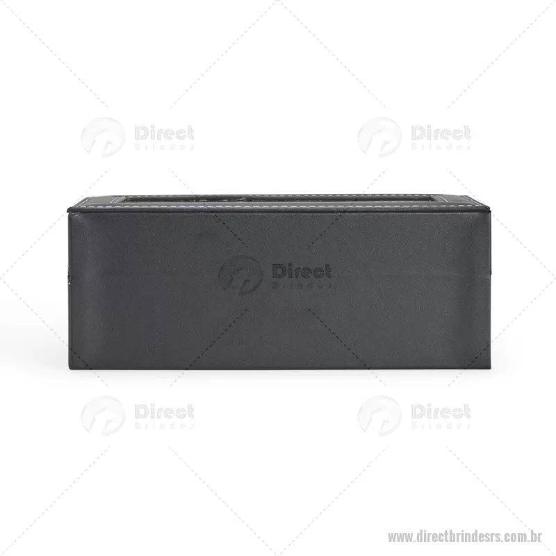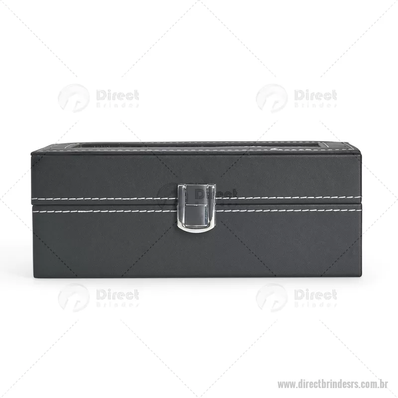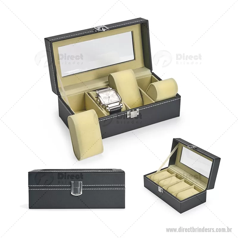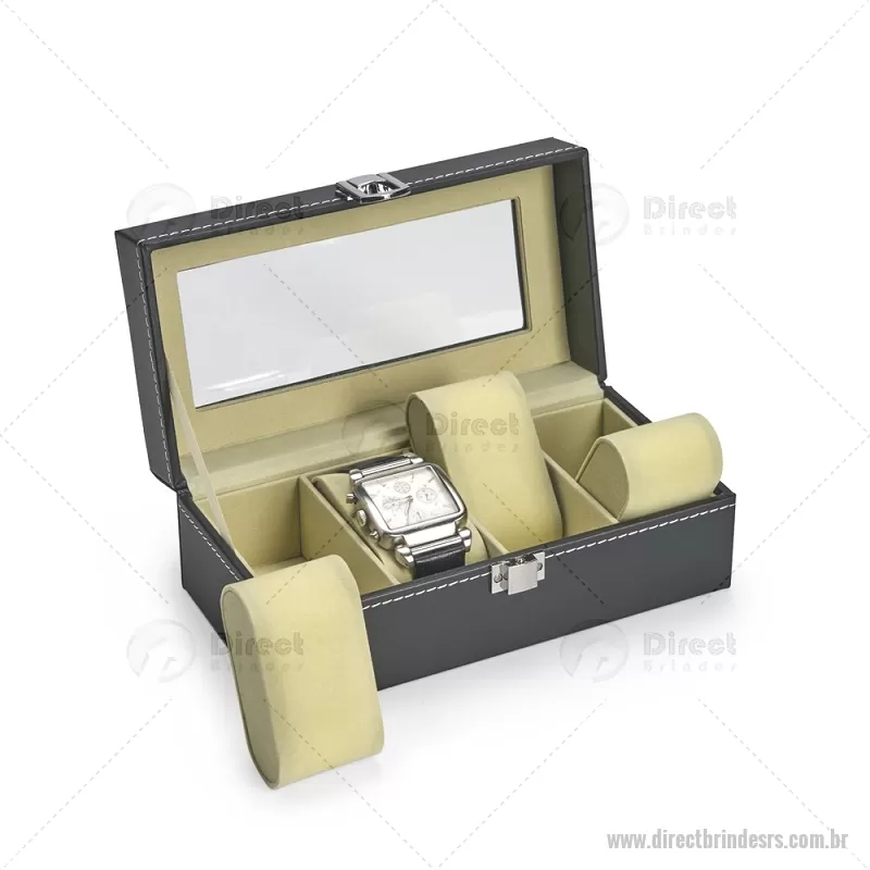 Porta-relógios com acabamento em couro sintético em PVC e interior forrado em veludo. Possui quatro compartimentos com almofadas de espuma removíveis, visor superior em vidro e trava de segurança, ideal para organizar e proteger relógios com elegância. - - DRTRSPREL003