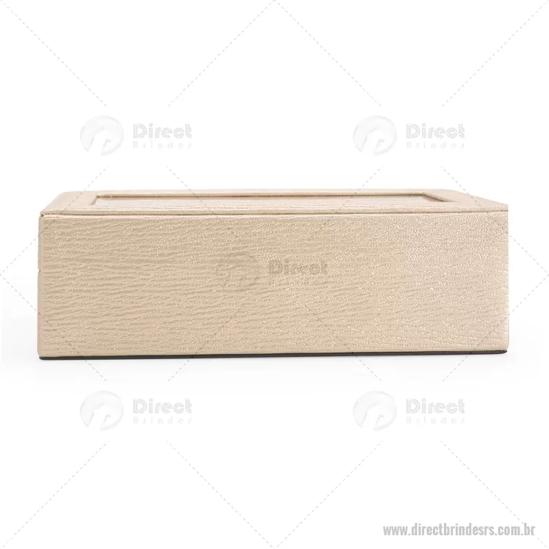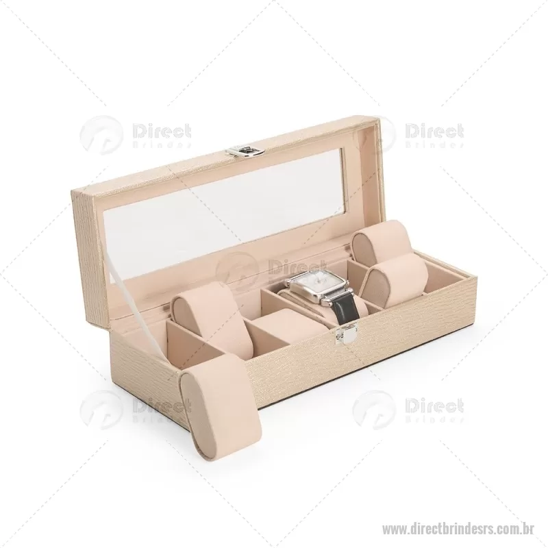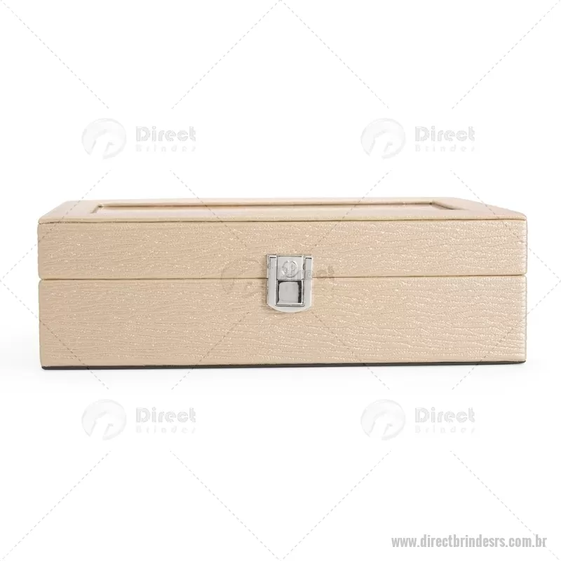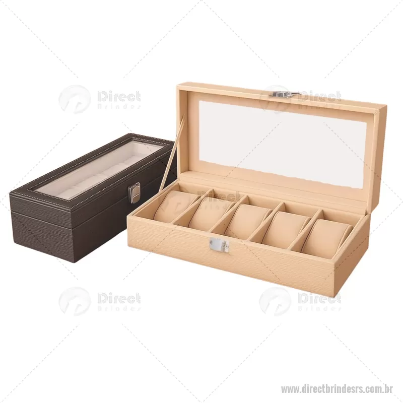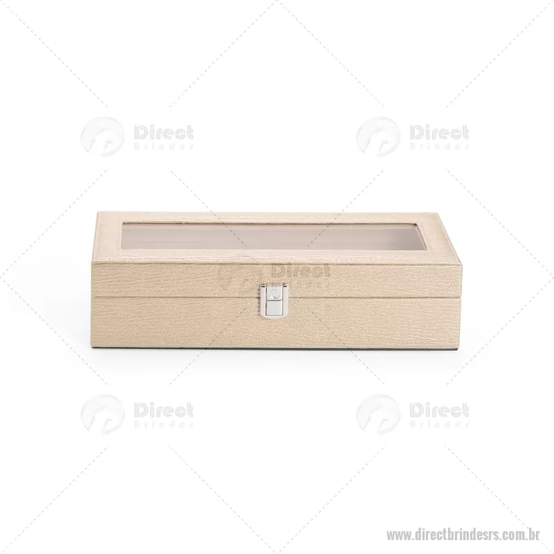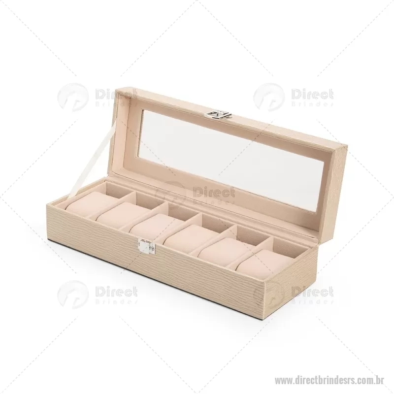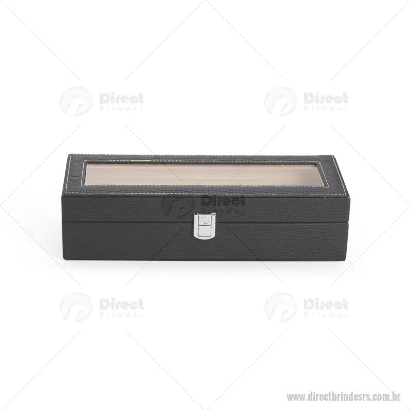 Porta-relógios com acabamento em couro sintético texturizado à base de PVC e interior revestido em tecido aveludado. Possui seis compartimentos com almofadas removíveis, visor em vidro transparente e trava de segurança, ideal para organizar e proteger relógios com elegância. - - DRTRSPREL004