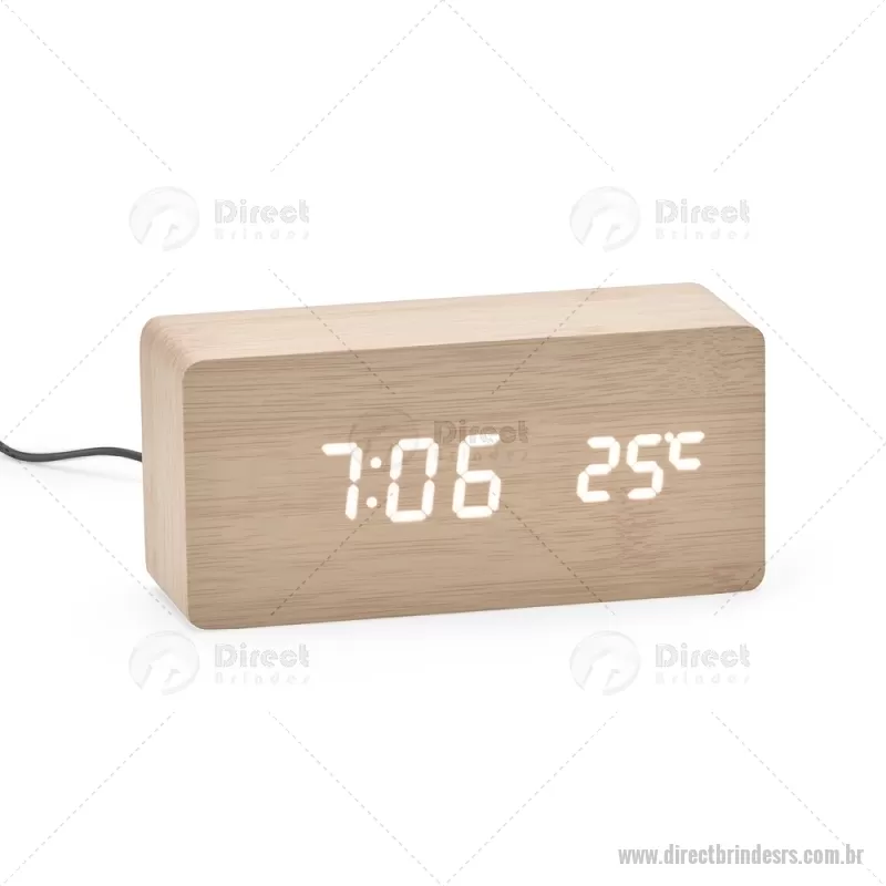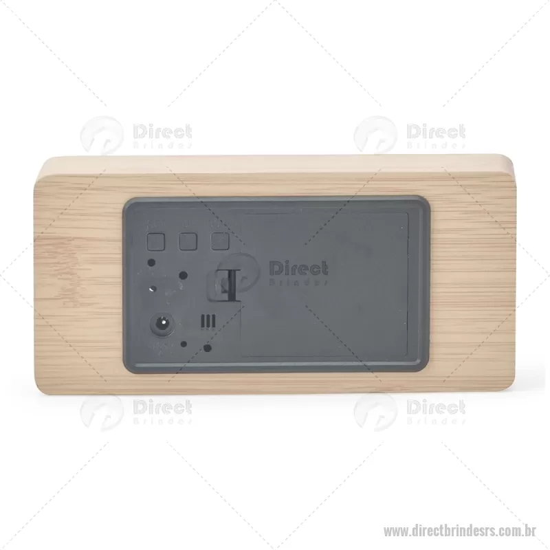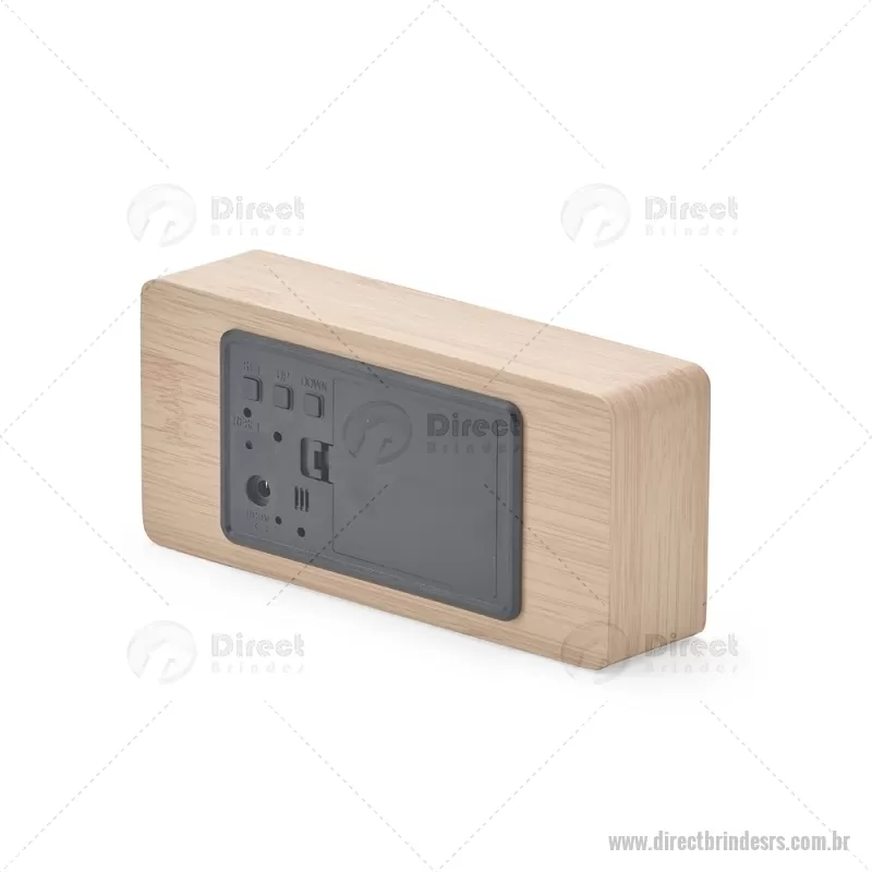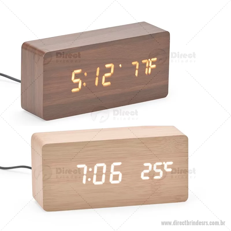 Relógio despertador em madeira com display LED, que combina design elegante e tecnologia moderna. Exibe horas, data e temperatura ambiente, além de permitir a programação de até três alarmes com diferentes configurações. Pode ser alimentado por 4 pilhas AAA (não inclusas) ou por cabo USB DC 5V, que acompanha o produto, oferecendo praticidade para o uso diário. - - DRTRSREL023