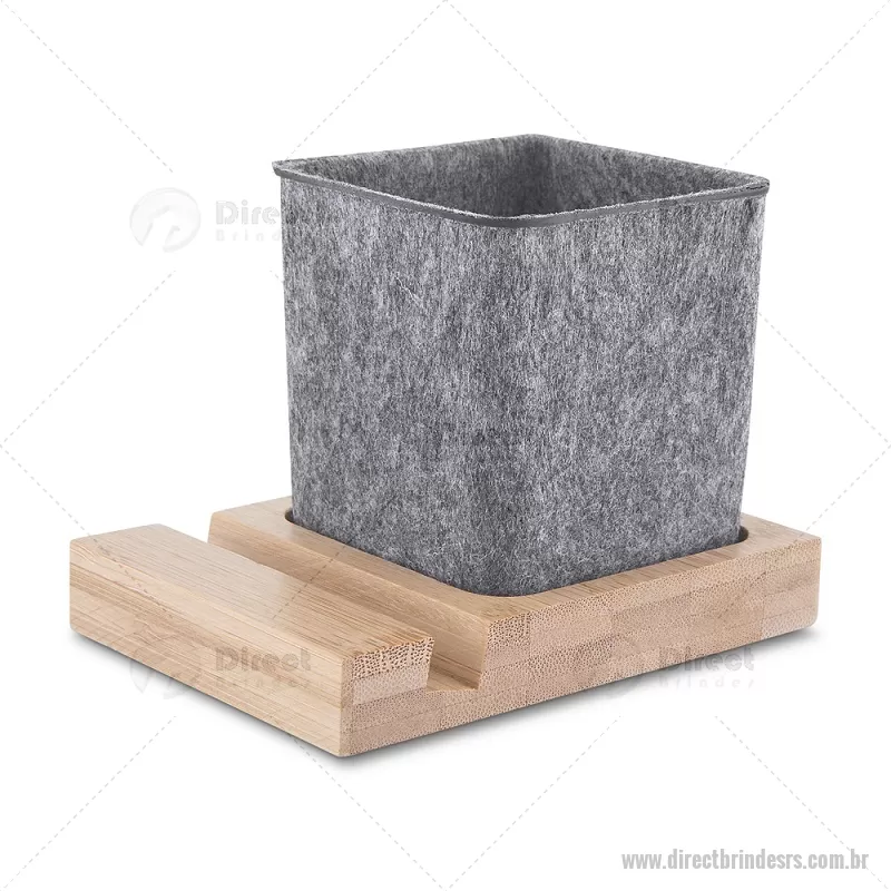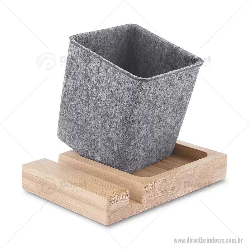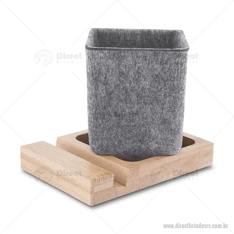 Porta objetos/smartphone em feltro e bambu Porta-objetos em feltro reciclado com suporte para celular em bambu. Prático e versátil, ideal para organizar canetas, lápis, marcadores e manter a mesa de escritório sempre funcional e elegante. Peso do Produto: 0,112kg Dimensão do Produto: (1,7x11,7x8,5cm) (Base em bambú) Dimensão do Produto: 8x6,5x6,5cm (Porta Caneta) - - DRTRSPC021